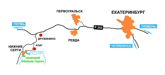 — на автомобиле: ехать по Московскому тракту, далее направо по указателю «Нижние Серги», в городе двигаться по главной дороге, на выезде из города поворот налево (есть указатель), дорога ведет прямо к воротам санатория.